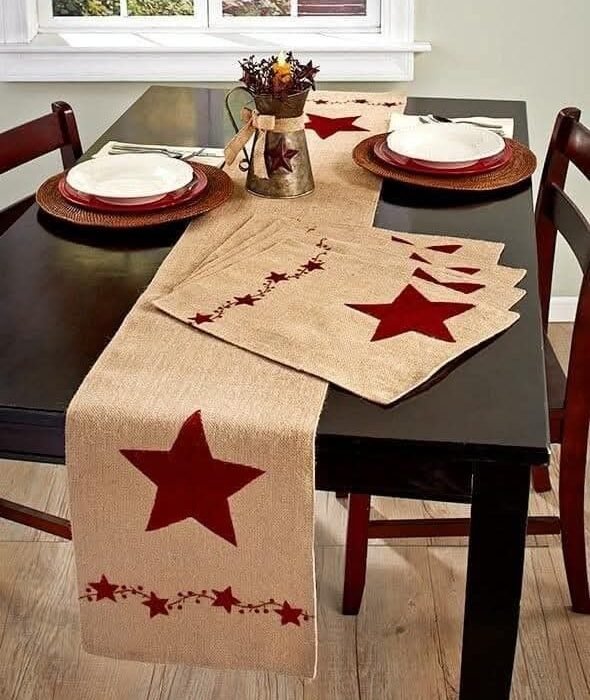 Un camino de mesa es fundamental. Si utilizas arpillera de yute, no necesitas un dobladillo. De hecho, el borde deshilachado es parte de su encanto rústico.