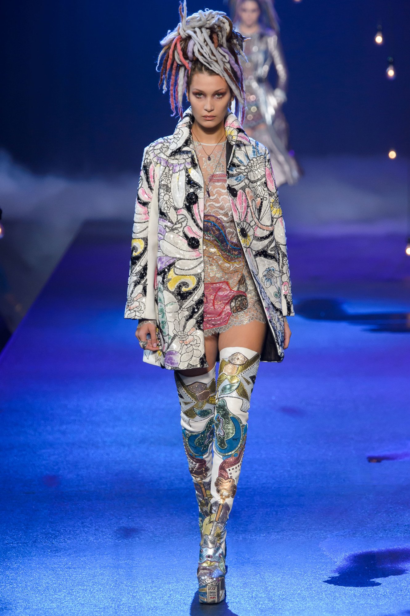 La vibra la describo como “Candy Raver”, muy dulce y demente al mismo tiempo. Emuló el sentimiento de frenesí y locura que se siente durante el verano, sobre todo en festivales de música electrónica o en islas tipo Ibiza. Aunque a primera vista todo parecía muy chiflado, la realidad fue que presentó una colección muy completa, atractiva y fácil de lucir. Se mantuvo a la par de las tendencias exageradas, mangas anchas, cinturas asimétricas, pantalones altos y colores varios: pasteles, metalizados, neón, brillantes. Uno de mis favoritos fue el vestido con cadenas que utilizó Kendall Jenner bajo un abrigo metalizado y con aplicaciones en forma de corazón.