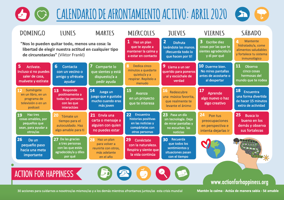 Así, realizaron un calendario de la felicidad diaria, que me permito compartir con ustedes porque creo que nos ayudará a muchos.