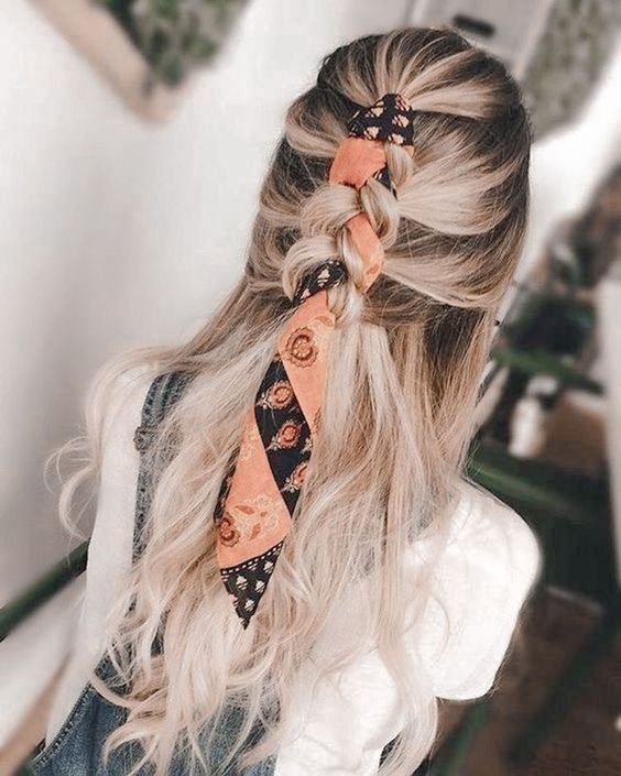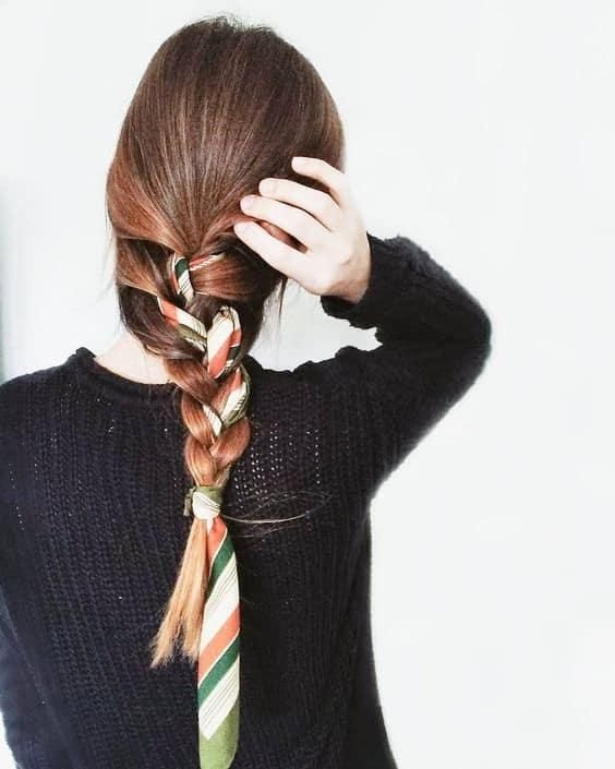 Trenzas enroscadas con telas y/o anillos para el cabello. Esta es una manera de hacerte una cola de caballo baja con mucha creatividad, además cuando sueltes tu cabello, tendrás unas ondas naturales gracias al enroscado.