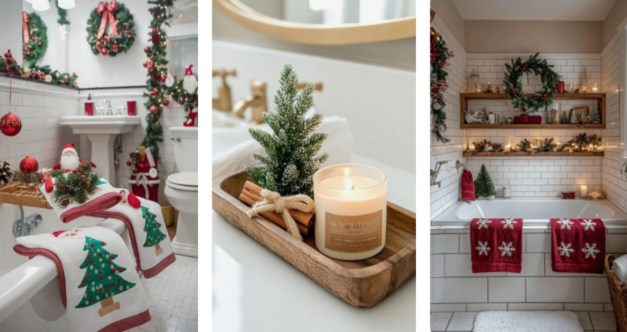 La magia de la decoración navideña está en los detalles. No necesitas grandes adornos para crear un ambiente festivo. Coloca pequeñas guirnaldas con luces LED en el espejo o alrededor de la ventana. Un lazo de terciopelo rojo en el grifo o en el dispensador de jabón puede añadir un toque de estilo y sofisticación. Si tienes una repisa, decórala con mini árboles de navidad, piñas y velas. Las velas no solo aportan un brillo cálido, sino que también pueden llenar el espacio con fragancias festivas como canela, jengibre o pino.