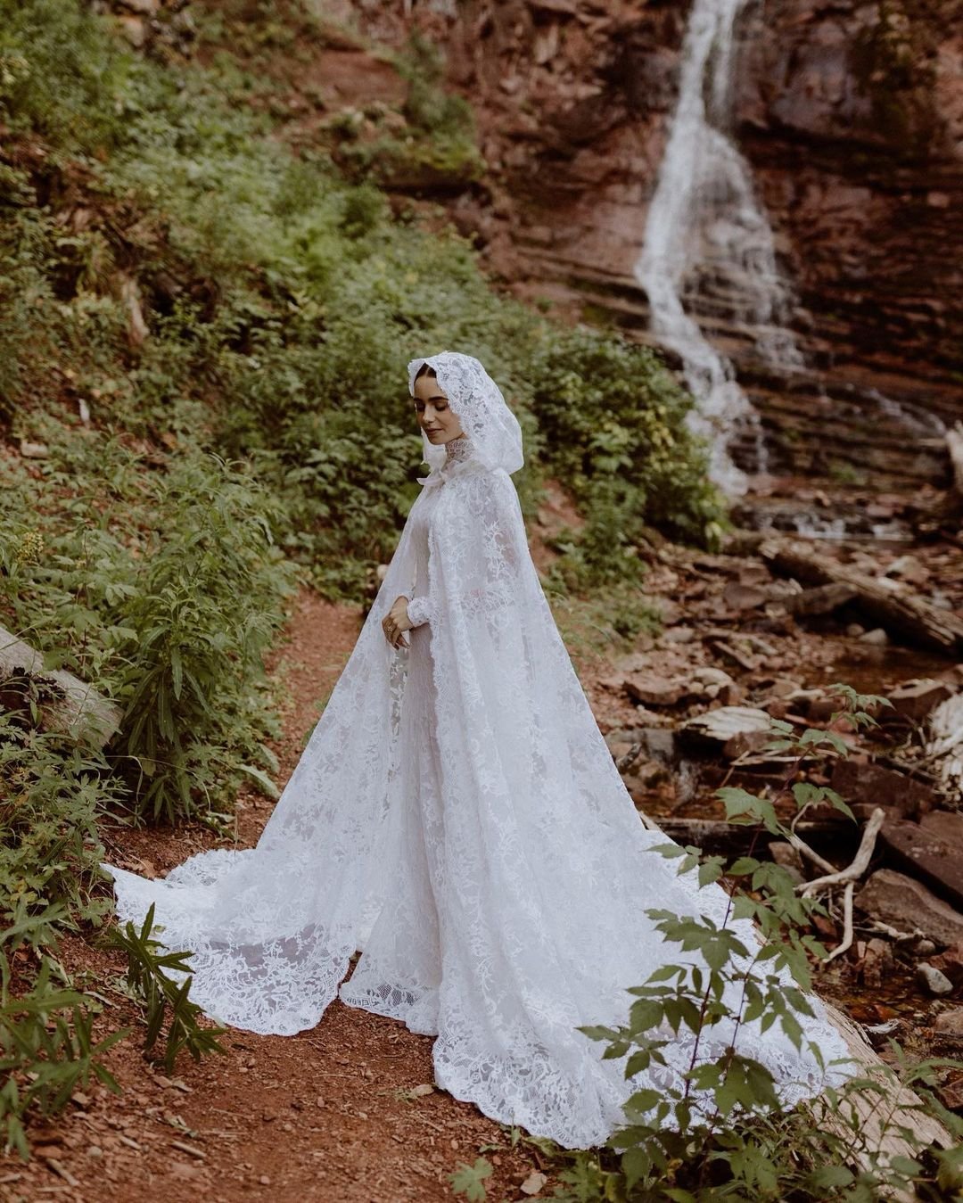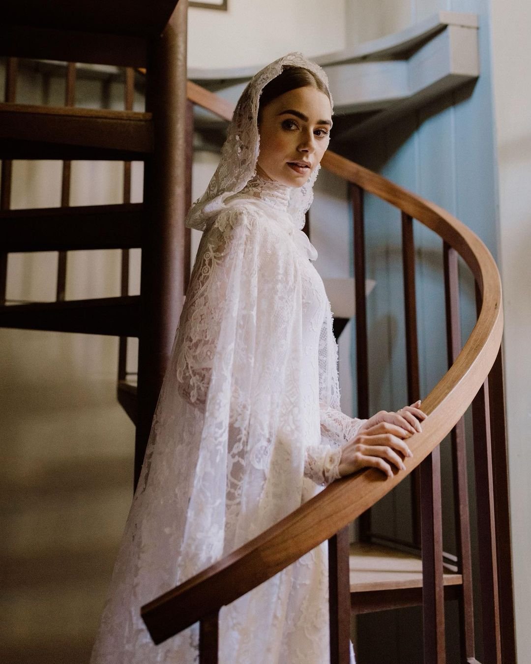 Lily lució un diseño clásico de encaje con corte sirena, mangas largas transparentes y cuello cisne; a juego, usó una capa con capucha que sustituyó el velo tradicional.