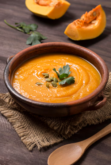 - Cena. Sopa de calabaza con un toque de jengibre y acompañada de tostadas de pan integral. Confortable y nutritiva.