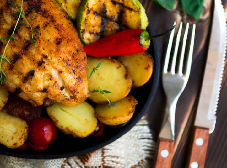 - Almuerzo. Pollo asado con vegetales al horno (zanahorias, cebollas, pimientos). Las sobras pueden servir para el almuerzo del lunes.