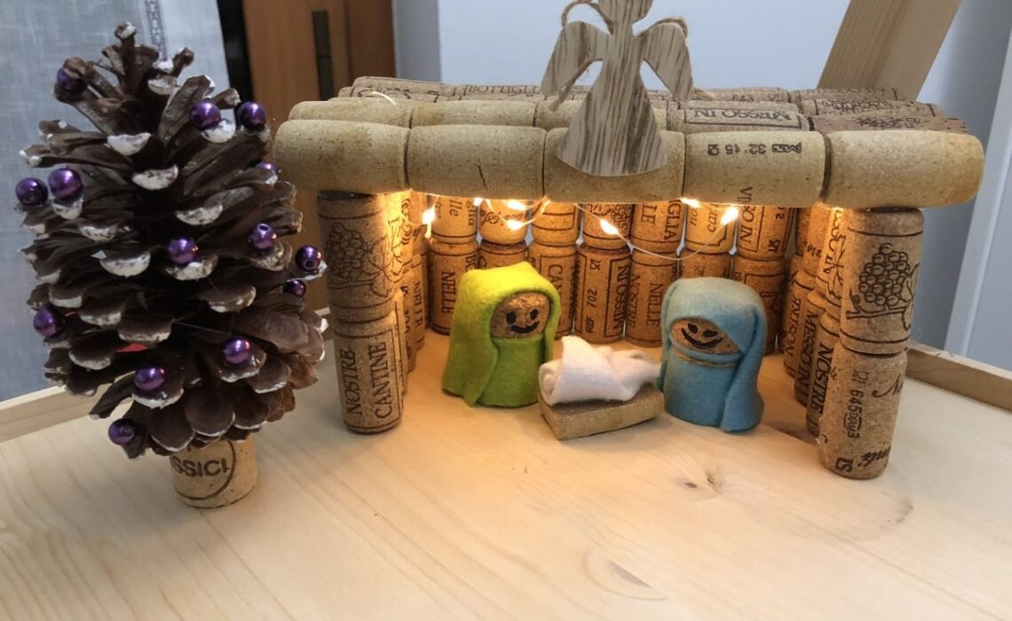 Los corchos reciclados son otro material excelente para las miniaturas. Con un cuchillo de modelar, se puede tallar la forma del cuerpo, o simplemente usar el corcho como base para pegar las cabezas (cuentas de madera) y los mantos (pequeños retazos de tela). La base del establo se puede construir con trozos de corteza de árbol o palitos de helado pegados. Es un pesebre pequeño con un aire eco-friendly que resalta la textura natural de la madera.