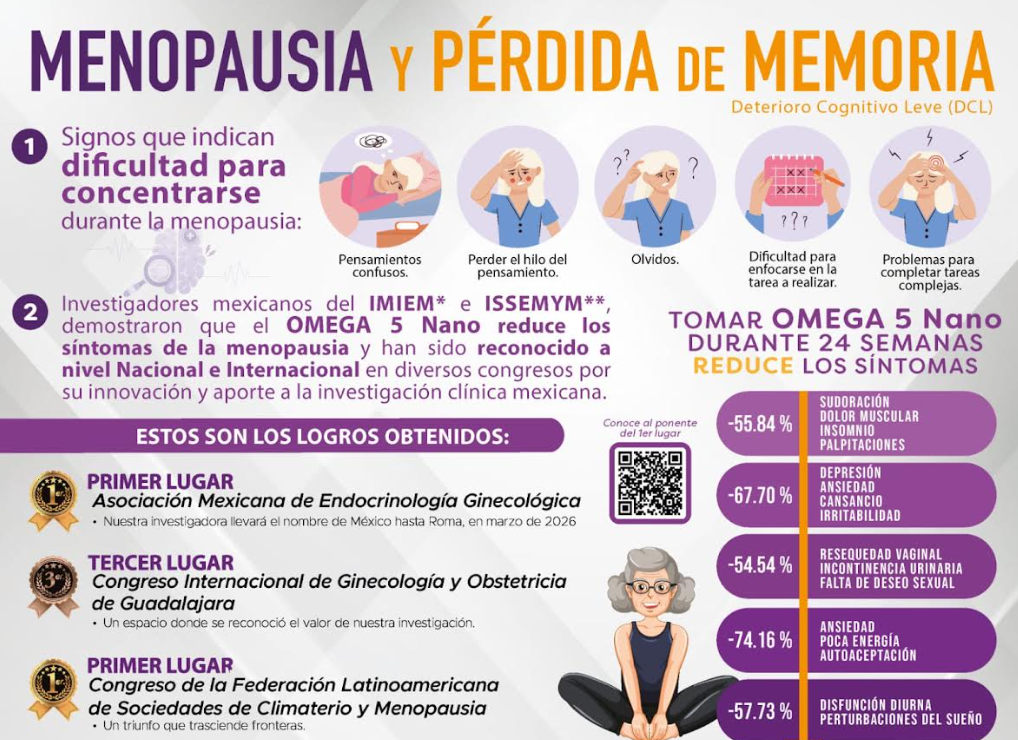Liderado por las doctoras Araceli Espinosa Guerrero y Esmeralda Fabiola García Molina, junto a un equipo de investigadores, el ensayo «Análisis del efecto terapéutico del Omega 5 Nano en la calidad de vida de las mujeres con síndrome climatérico» proporciona evidencia científica contundente.