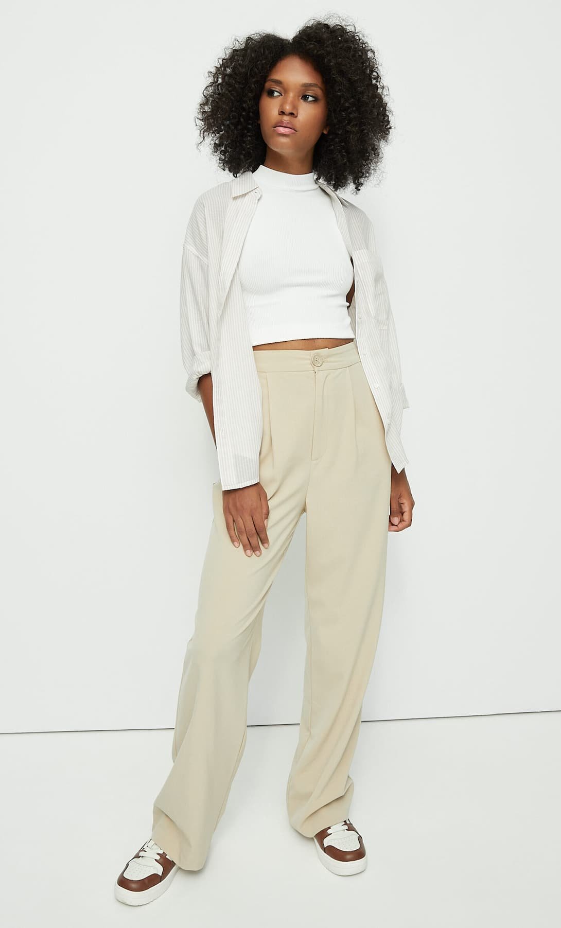- El crop top es de esas prendas que llegaron para quedarse, sácale provecho y úsalos con tus pantalones formales favoritos.