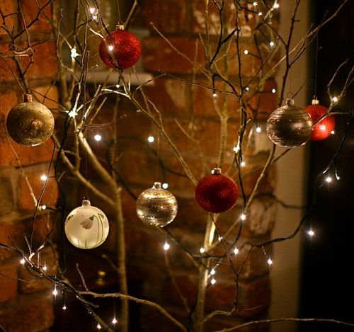 Árbol de Navidad alternativo. Para espacios pequeños, varias ramas grandes colgadas en la pared o aseguradas en un jarrón pueden reemplazar el árbol tradicional. Cuelga tarjetas navideñas, luces led pequeñas o fotos familiares de ellas.