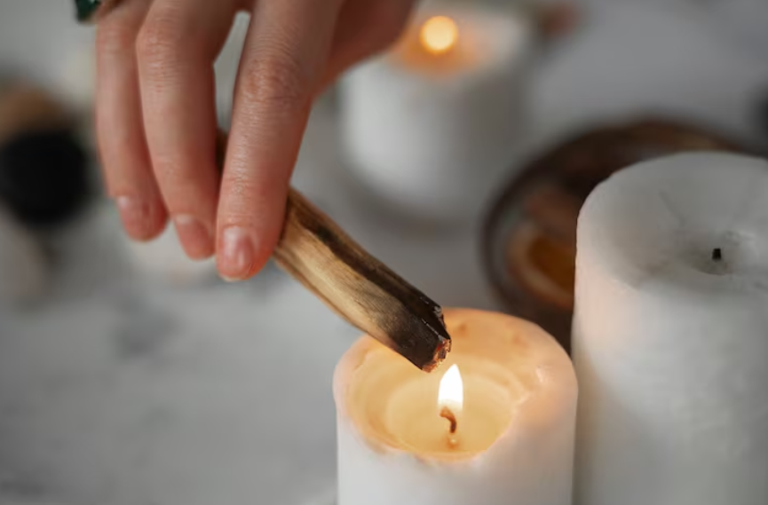 - Limpieza energética (2 min). Enciende un palo santo o un poco de salvia blanca y pasa el humo sagrado alrededor de tu cuerpo y de tu espacio, con la intención de limpiar y purificar.