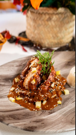 La guayaba, fruta originaria de Mesoamérica, aporta notas aromáticas y dulces que dialogan con el carácter especiado del mole. Esta creación contemporánea demuestra cómo el mole es una salsa viva, capaz de reinventarse sin perder su esencia. Es una de las propuestas más celebradas por su equilibrio y originalidad.