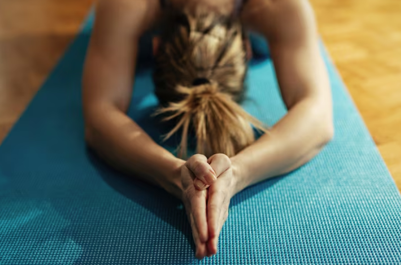 Siéntate en el suelo con las plantas de los pies unidas y las rodillas cayendo hacia los lados. Puedes sostener tus pies con las manos. Esta postura abre las caderas y la ingle, áreas donde solemos acumular estrés. Si te sientes cómoda, inclina el torso hacia adelante para un estiramiento más profundo. Permanece en la postura por 3-5 minutos, permitiendo que tus músculos se relajen.